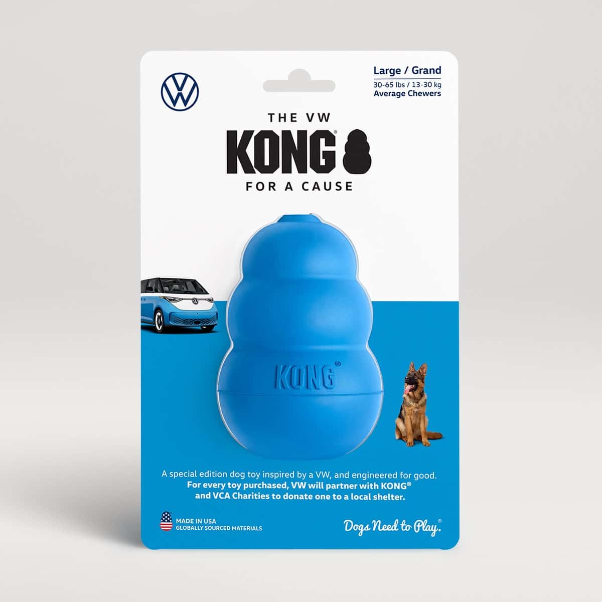 Presque 50 ans plus tard, Volkswagen décide de rendre hommage à cette histoire improbable. À l’occasion de la Journée nationale du chiot aux États-Unis, la marque s’associe à KONG et à l’association VCA Charities pour sortir une édition spéciale du jouet—cette fois inspirée de l’ID. Buzz, le van 100 % électrique qui réinvente l’esprit du Combi. Le jouet reprend la forme originale du KONG mais s’habille d’un bleu vif baptisé “Cabana Blue” avec un packaging spécial marqué VW. Il est vendu 13,99 $, soit 12,89 € (avec un petit supplément pour la livraison). Mais le plus cool, c’est ce qu’il y a derrière : pour chaque jouet acheté, un autre est offert à un refuge pour chiens. Et 100 % des bénéfices sont reversés à une asso qui soutient les animaux en attente d’adoption. C’est une édition limitée, disponible en ligne. La campagne est lancée aux États-Unis, mais on ne sait pas encore si elle sera livrable en France. Dans tous les cas, c’est une excellente excuse pour gâter son chien.